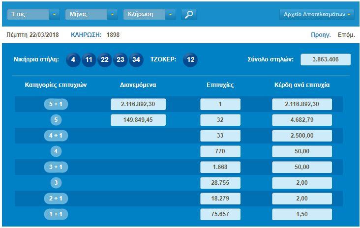 Οι τυχεροί αριθμοί που κληρώθηκαν είναι :4, 11, 22, 23, 34 και Τζόκερ ο αριθμός: 12.