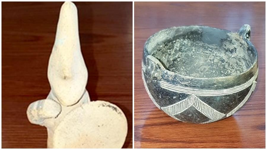 Το πρώτο αντικείμενο είναι ένα πήλινο ειδώλιο ενός πολεμιστή με ασπίδα που χρονολογείται στην Κυπρο-Αρχαϊκή περίοδο (7ος αιώνας π.Χ.). Το δεύτερο αντικείμενο είναι ένα πήλινο κύπελλο με εγχάρακτη διακόσμηση. Το κύπελλο χρονολογείται στην Πρώιμη Εποχή του Χαλκού (περίπου 2000 π.Χ.).