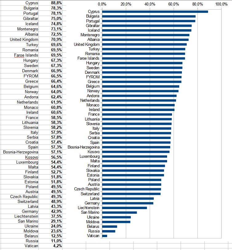 Η Κύπρος κατέχει την πρώτη θέση με ποσοστό 88% με διαφορά δέκα περίπου πόντων από την δεύτερη στη λίστα, Βουλγαρία και την τρίτη Πορτογαλία ενώ, στην τελευταία θέση με πολύ χαμηλό ποσοστό, μόλις 4% βρίσκεται το Βατικανό.
