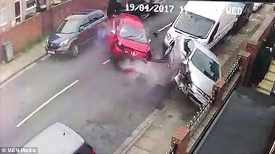 Στο βίντεο φαίνεται ξεκάθαρα η στιγμή που ένα κόκκινο αμάξι έρχεται με ταχύτητα από το δρόμο και ξαφνικά ξεφεύγει από την πορεία του και πέφτει πάνω σ' άλλα σταθμευμένα αμάξια, με τους κάτοικους της περιοχής να κοιτούν έντρομοι και σοκαρισμένοι το περιστατικό.