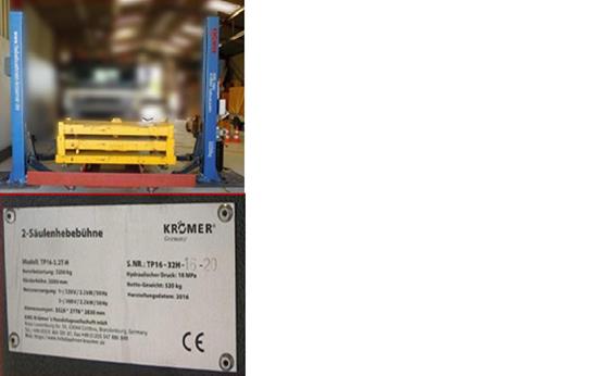 Ανυψωτήρας οχημάτων γερμανικήςπροέλευσης, εμπορικής επωνυμίας KROMER, με άγνωστη ονομασία και γραμμικό κωδικό παρτίδας, με τύπο / αριθμό μοντέλου TP 16-3.2T-H, ο οποίος εντοπίστηκε στη Γαλλία.