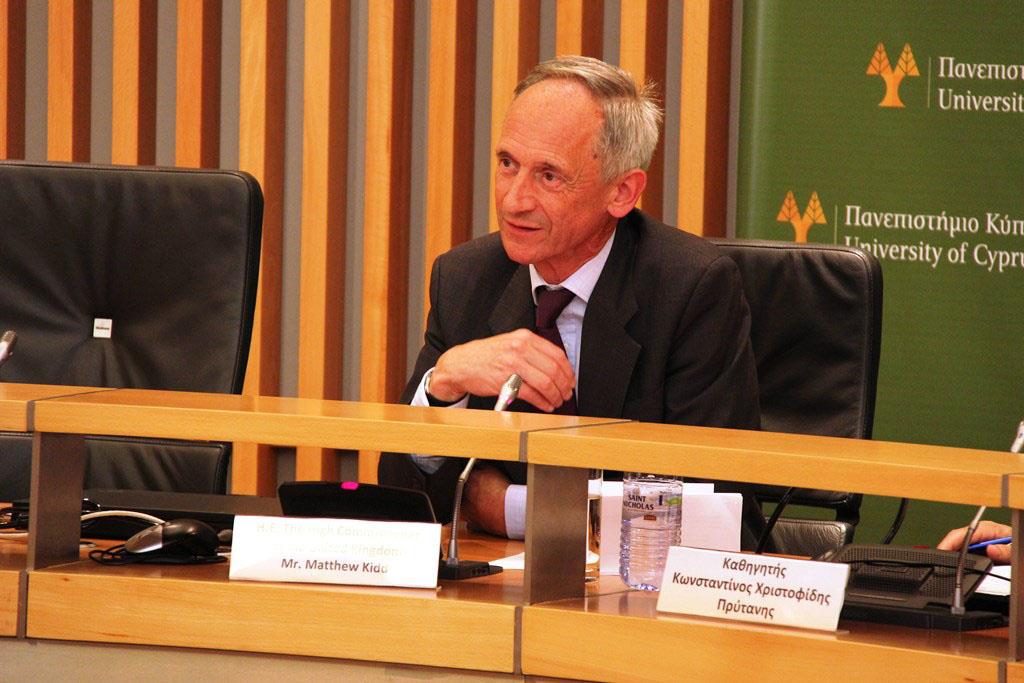 Ο Πρύτανης του Πανεπιστημίου Κύπρου, Καθηγητής Κωνσταντίνος Χριστοφίδης,  αφού καλωσόρισε και ευχαρίστησε τον Ύπατο Αρμοστή της Βρετανίας στην Κύπρο, κ. Matthew Kidd για την ομιλία του, επεσήμανε ότι η εκδήλωση αυτή συμπίπτει με μια περίοδο ιστορική για την περιοχή. Χωρίς να επιλέξουμε το χρόνο διοργάνωσης του σημερινού γεγονότος, είπε ο Πρύτανης, αυτό συμπίπτει σε μια κρίσιμη περίοδο τόσο ιστορική όσο και γεωπολιτική  για την περιοχή. Απευθυνόμενος στον Βρετανό Ύπατο Αρμοστή εξέφρασε την πεποίθηση πως θα έχει σημαντικό έργο και ρόλο να διαδραματίσει και στη συνέχεια στην Κοινοπολιτεία.