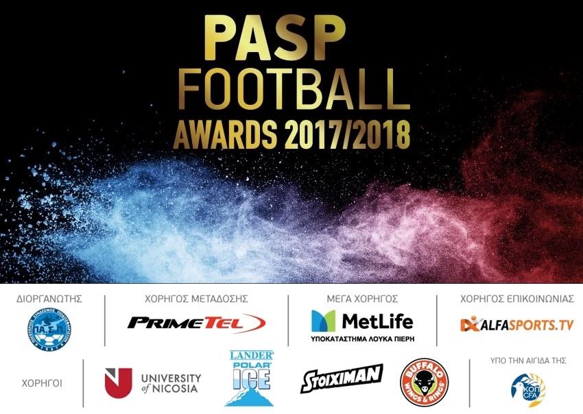 Τα σημαντικότερα ετήσια ποδοσφαιρικά βραβεία στην Κύπρο διοργανώνει γι΄ άλλη μια χρονιά ο Παγκύπριος Σύνδεσμος Ποδοσφαιριστών (ΠΑ.Σ.Π.). Την Πέμπτη 10 Μαΐου 2018 στις 20:30 στο Royal Hall στη Λευκωσία, σε ζωντανή μετάδοση από την Primetel, όσοι διακρίθηκαν στο κυπριακό ποδόσφαιρο τη σεζόν 2017/18 θα τιμηθούν από τον ΠΑ.Σ.Π., σε μία λαμπερή εκδήλωση -επίσημης ενδυμασίας- με τίτλο «PASP Football Awards 2017/2018».