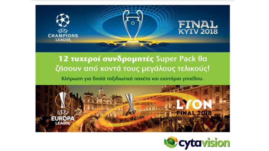 Για άλλη μια χρονιά, οι πελάτες της Cyta που έχουν το Super Pack της Cytavision, έχουν την ευκαιρία να ζήσουν μοναδικές ποδοσφαιρικές εμπειρίες από προνομιακές θέσεις, στους τελικούς ποδοσφαιρικούς αγώνες των κορυφαίων διασυλλογικών διοργανώσεων UEFA Champions League και UEFA Europa League, για τις οποίες η Cytavision κατέχει τα αποκλειστικά δικαιώματα μετάδοσης μέχρι το 2021.