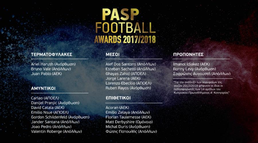 Λιγότερο από μια εβδομάδα απομένει για τη μεγάλη γιορτή του κυπριακού ποδοσφαίρου, τα «PASP Football Awards 2018» -τα ετήσια βραβεία που διοργανώνει ο Παγκύπριος Σύνδεσμος Ποδοσφαιριστών (ΠΑ.Σ.Π.) και στα οποία τιμώνται οι κορυφαίοι της σεζόν.