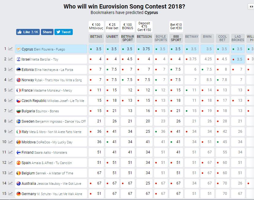Η πορεία των φετινών στοιχημάτων μας θυμίζει τα περσινά. Η Netta ήταν το απόλυτο φαβορί ακριβώς όπως ήταν πέρσι ο Francesco Gabbani, όλη την περίοδο μέχρι το διαγωνισμό. Η πρωτιά αυτή χάθηκε μετά τη Jury Rehearsal του ημιτελικού τη Δευτέρα, ακριβώς όπως συμβαίνει και φέτος.