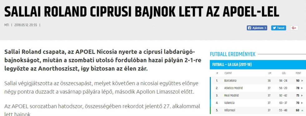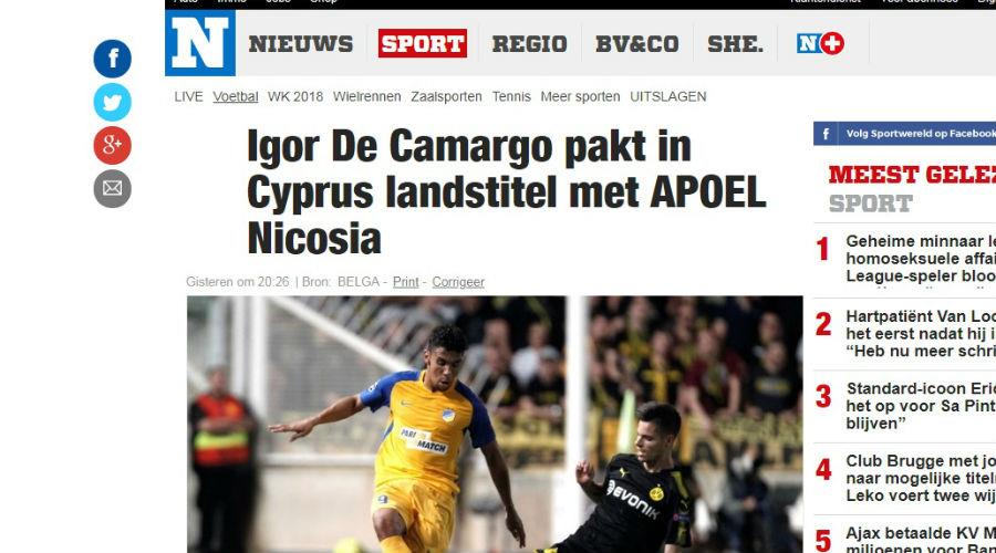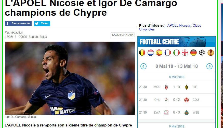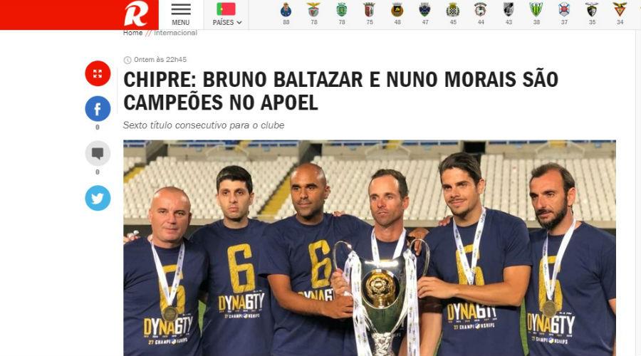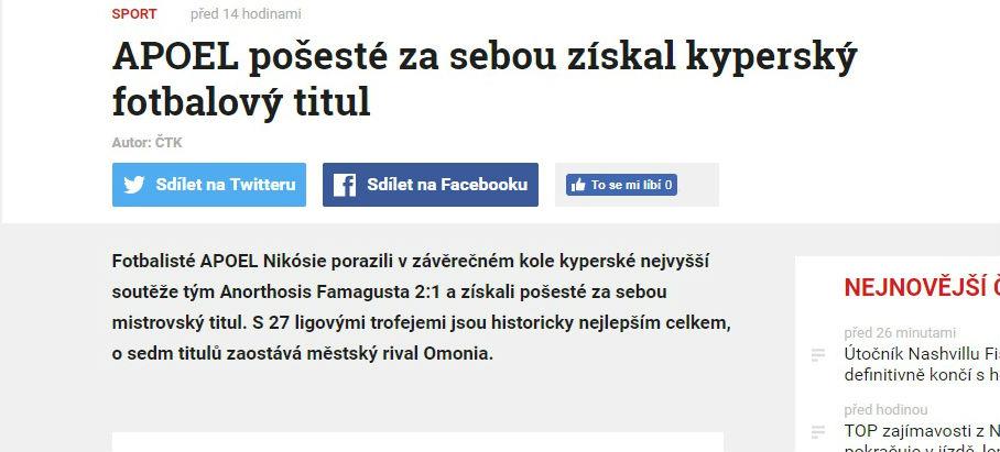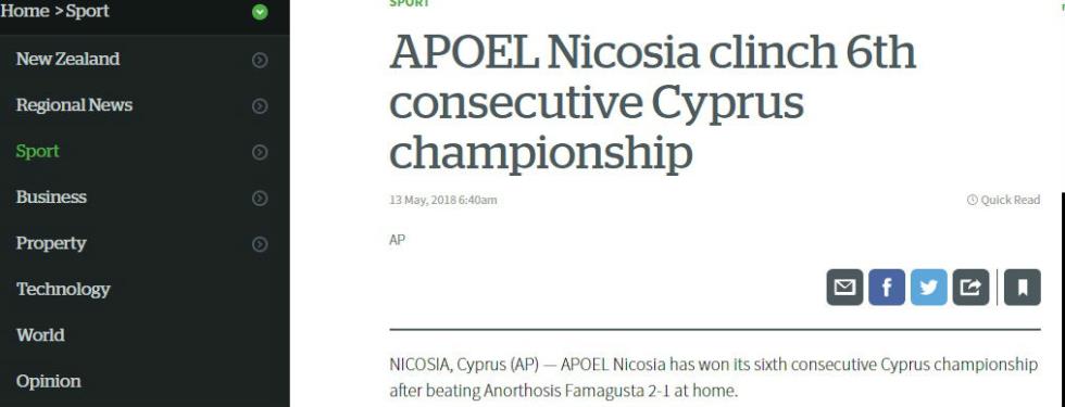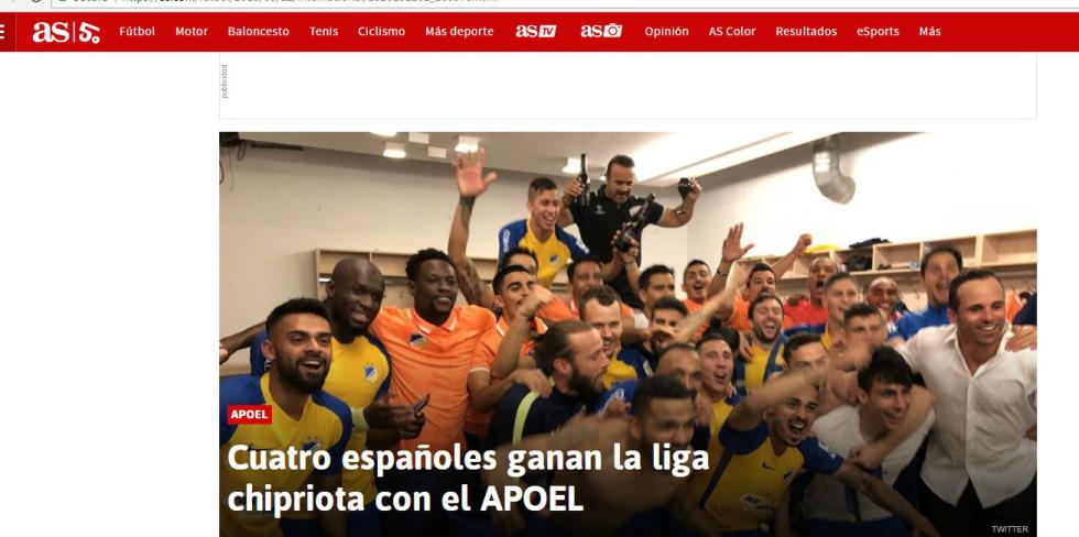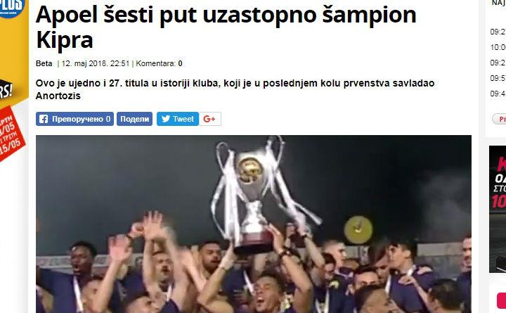 Ο ΑΠΟΕΛ πανηγυρίζει το έκτο σερί και 27ο συνολικά τίτλο στην ιστορία του. Αναφορά στην κατάκτηση του φετινού πρωταθλήματος των γαλαζοκιτρίνων γίνεται και από διάφορα Μέσα του εξωτερικού.
