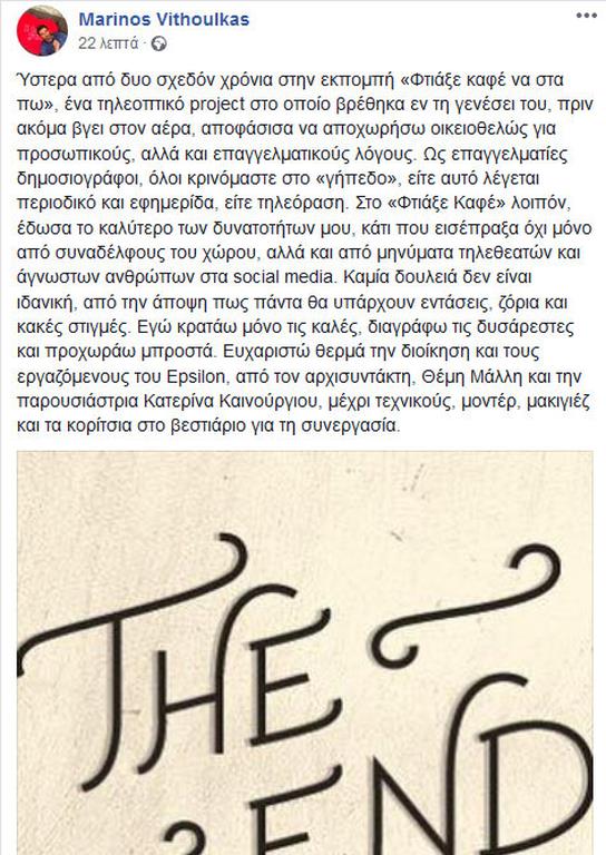 «Ύστερα από δυο σχεδόν χρόνια στην εκπομπή «Φτιάξε καφέ να στα πω», ένα τηλεοπτικό project στο οποίο βρέθηκα εν τη γενέσει του, πριν ακόμα βγει στον αέρα, αποφάσισα να αποχωρήσω οικειοθελώς για προσωπικούς, αλλά και επαγγελματικούς λόγους. Ως επαγγελματίες δημοσιογράφοι, όλοι κρινόμαστε στο «γήπεδο», είτε αυτό λέγεται περιοδικό και εφημερίδα, είτε τηλεόραση. Στο «Φτιάξε Καφέ» λοιπόν, έδωσα το καλύτερο των δυνατοτήτων μου, κάτι που εισέπραξα όχι μόνο από συναδέλφους του χώρου, αλλά και από μηνύματα τηλεθεατών και άγνωστων ανθρώπων στα social media. Καμία δουλειά δεν είναι ιδανική, από την άποψη πως πάντα θα υπάρχουν εντάσεις, ζόρια και κακές στιγμές. Εγώ κρατάω μόνο τις καλές, διαγράφω τις δυσάρεστες και προχωράω μπροστά. Ευχαριστώ θερμά την διοίκηση και τους εργαζόμενους του Epsilon, από τον αρχισυντάκτη, Θέμη Μάλλη και την παρουσιάστρια Κατερίνα Καινούργιου, μέχρι τεχνικούς, μοντέρ, μακιγιέζ και τα κορίτσια στο βεστιάριο για τη συνεργασία», έγραψε ο ίδιος.