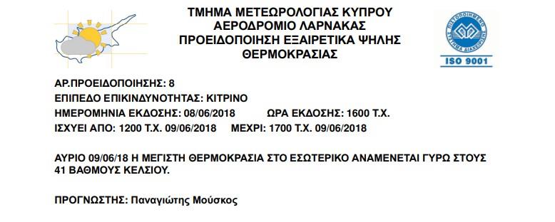 Η Μετεωρολογική Υπηρεσία κρούει τον κώδωνα του κινδύνου για τις ευάλωτες ομάδες του πληθυσμούς όπως είναι οι ηλικιωμένοι και τα μικρά παιδιά ούτως ώστε να μην εκτεθούν στον ήλιο.