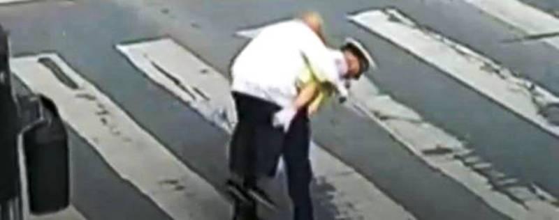 Ο ηλικιωμένος βρισκόταν μόλις στο ένα τρίτο της διάβασης πεζών όταν άναψε το πράσινο φως για την κίνηση των οχημάτων. Τότε, ο τροχονόμος πλησίασε τον ηλικιωμένο, τον πήρε στις πλάτες του για να περάσουν γρήγορα και με ασφάλεια τον δρόμο.
