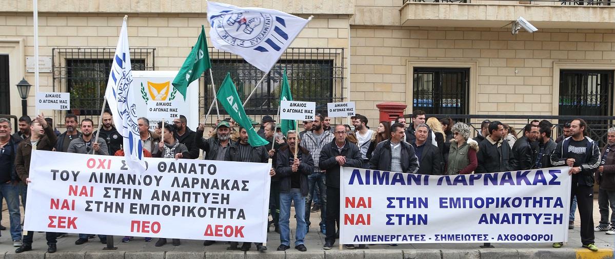 Κρατώντας πανό που ανέγραφαν “Όχι στο θάνατο του λιμανιού Λάρνακας, Ναι στην εμπορικότητα”, οι εργαζόμενοι λιμενεργάτες, σημειωτές, αδειούχοι αχθοφόροι, υπάλληλοι της ΑΛΚ, φρουροί ειδικής φύλαξης και πρώην εργαζόμενοι στις εταιρείες MEDSEV και ENI, πραγματοποίησαν εκδήλωση διαμαρτυρίας έξω από το Υπουργείο Μεταφορών με αφορμή την απόφαση του Δημοτικού Συμβουλίου Λάρνακας να απορρίψει το αίτημα των εταιρειών ΤΟΤΑL και ENI για χρήση των εγκαταστάσεων του λιμανιού για περίοδο έξι μηνών και ενός χρόνου αντίστοιχα.