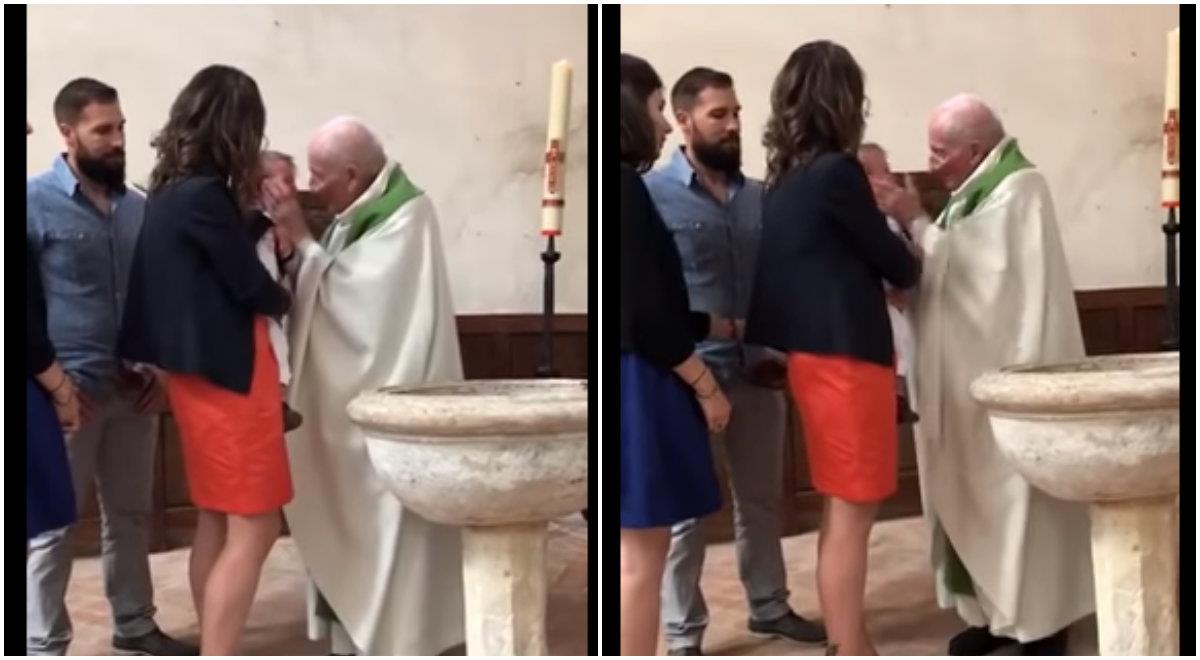 Σε ένα βίντεο που αναρτήθηκε και έχει συγκεντρώσει εκατομμύρια θεάσεις διακρίνεται ο 89χρονος ιερέας, ενώ ετοιμάζεται σε έναν ναό στο Σαμπό να βαπτίσει ένα μωρό που κλαίει ασταμάτητα.