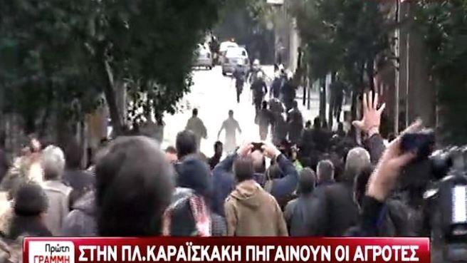 Οι αγρότες που είχαν συγκεντρωθεί έξω από το υπουργείο Αγροτικής Ανάπτυξης, εξαγριώθηκαν όταν πληροφορήθηκαν για την κίνηση της αστυνομίας, κατέβηκαν μέχρι την πλατεία Καραΐσκάκη και κυνήγησαν τα ΜΑΤ που έφυγαν τρέχοντας από το σημείο.