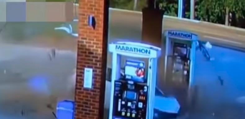 Η κάμερα ασφαλείας σε ένα βενζινάδικο κατέγραψε την τρελή κούρσα ενός αυτοκινήτου, η οποία κατέληξε σε «απογείωσή» του και «κάρφωμα» ανάμεσα στις αντλίες καυσίμου.