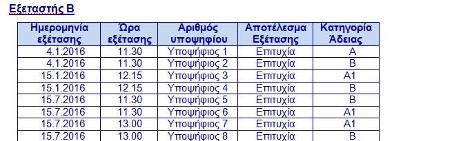 Παρατηρήθηκε ότι, ενώ, σύμφωνα με το μητρώο υπερωριών η εξέταση για υποψήφιο οδηγό διενεργήθηκε στις 5.9.2015 από τον εξεταστή Β, το αποτέλεσμα της εξέτασης στο μηχανογραφικό σύστημα καταχωρήθηκε από τον εξεταστή Γ. Στις 5.9.2015 ο υποψήφιος οδηγός, δεν παρουσιάσθηκε σύμφωνα με το ημερήσιο πρόγραμμα εξεταζόμενων, ενώ στο μηχανογραφικό σύστημα η αίτηση του για εξέταση άδειας οδήγησης παρέμενε σε εκκρεμότητα μέχρι την ημέρα του ελέγχου. Σε άλλη περίπτωση, ενώ υποψήφιος οδηγός δεν υπόγραψε στην ημερήσια κατάσταση εξεταζόμενων στις 14.11.2015 για σκοπούς επιβεβαίωσης της παρουσίας του, ο εξεταστής Γ καταχώρησε αποτέλεσμα επιτυχημένης εξέτασης την ίδια ημέρα.