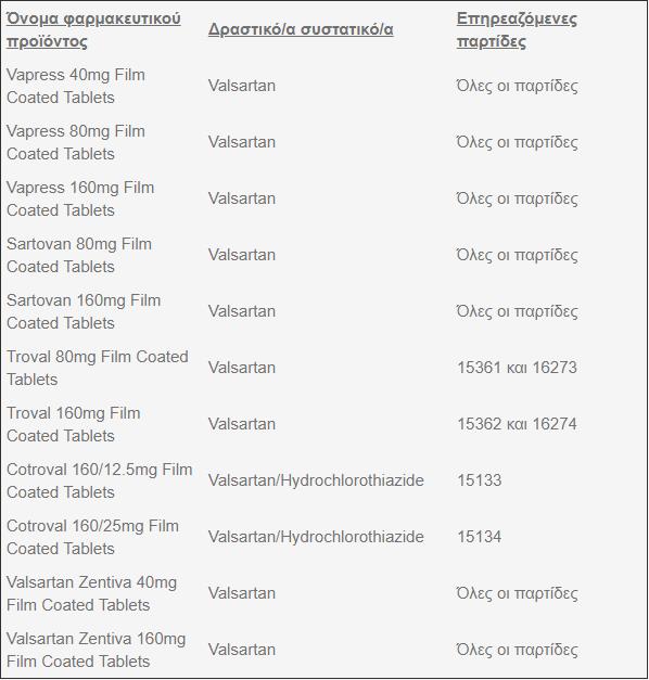 Oι Φαρμακευτικές Υπηρεσίες του Υπουργείου Υγείας ανακαλούν φαρμακευτικά προϊόντα τα οποία περιέχουν την ουσία Valsartan, ύστερα από ενημέρωση που έλαβαν από τον Ευρωπαϊκό Οργανισμό Φαρμάκων (ΕΜΑ) για σοβαρό πρόβλημα επιμόλυνσης της δραστικής πρώτης ύλης Valsartan.