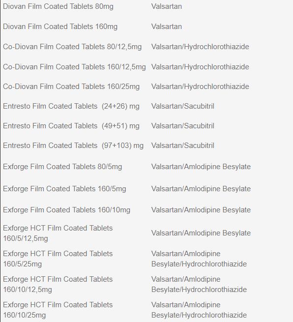 Την ίδια ώρα οι Φαρμακευτικές Υπηρεσίες ενημερώνουν τους επαγγελματίες υγείας ότι στην κυπριακή αγορά υπάρχουν διαθέσιμα τα πιο κάτω μη επηρεαζόμενα φαρμακευτικά προϊόντα που περιέχουν την ουσία Valsartan (μόνη της ή σε συνδυασμό με άλλη ουσία):