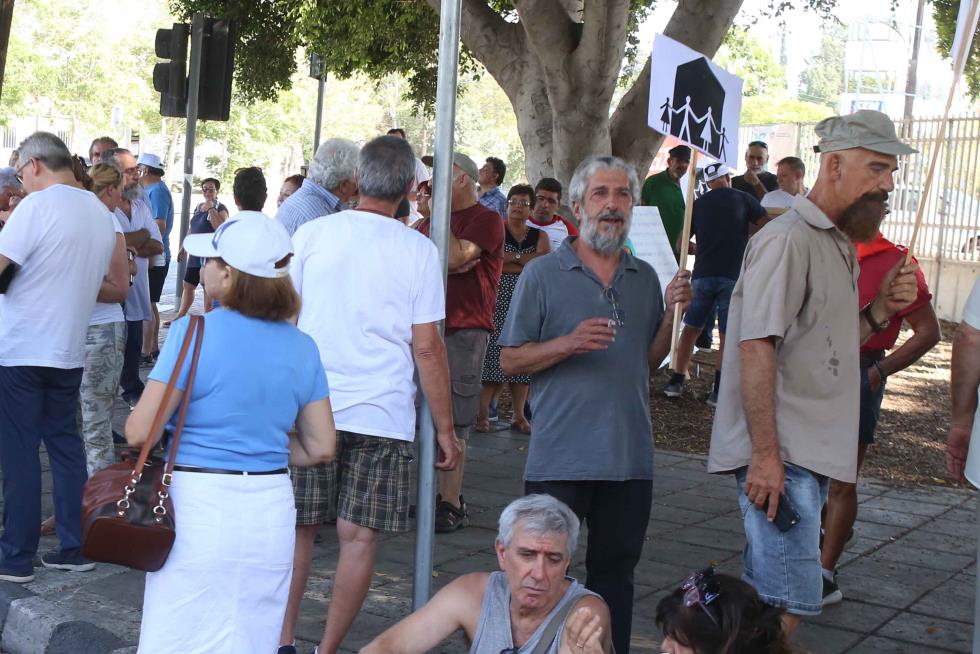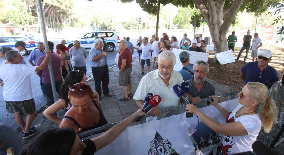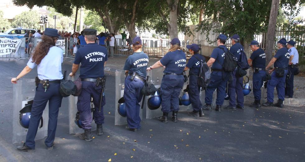 Τα μέλη της Δύναμης έχουν παραταχθει έξω από τη Βουλή την ώρα που το Κίνημα Ενάντια στις Εκποιήσεις με πανό διαδηλώνει ενάντια στην ψήφιση νόμων που θεωρούν ότι θα συμβάλουν στη διευκόλυνση των εκποιήσεων κατοικιών.