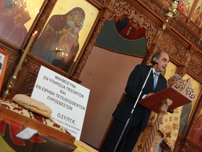 Χαρακτήρισε το σημερινό μνημόσυνο, «κατάθεση της ευγνωμοσύνης μας προς όλους τους πυροσβέστες που υπηρέτησαν την Κύπρο επιτελώντας το δύσκολο έργο της πυρόσβεσης και ταυτόχρονα συνιστά υπόμνηση της μεγάλης θυσίας των πεσόντων πυροσβεστών που υπηρετούσαν στη ναυτική βάση μαζί με τα άλλα γενναία παλικάρια μας στις 11 Ιουλίου 2011, ημέρα που έχει καταγραφεί ως μία από τις τραγικότερες στη σύγχρονη ιστορία της Κύπρου».