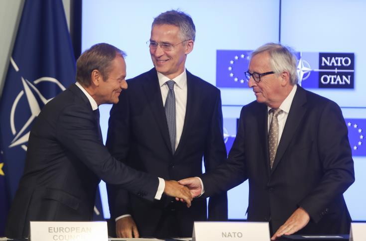 Κοινή διακήρυξη 11 σημείων, συνυπέγραψαν σήμερα Ευρωπαϊκή Ένωση και ΝΑΤΟ στις Βρυξέλλες, μία μέρα πριν από τη Σύνοδο Κορυφής της Συμμαχίας, με την οποία οι δύο οργανισμοί επαναβεβαιώνουν την ενίσχυση της συνεργασίας τους για την προώθηση της ειρήνης και της σταθερότητας στον ευρωατλαντικό χώρο.