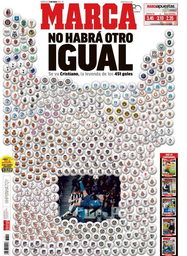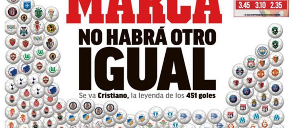 Η μαδριλένικη Marca εμπνεύστηκε για τον αποχαιρετισμό στον Πορτογάλο σούπερ σταρ ένα πρωτοσέλιδο με 451 μπάλες (όσες και τα τέρματα του CR7 με τη φανέλα της Ρεάλ), πάνω στις οποίες υπάρχει και το σήμα της ομάδας που δέχτηκε γκολ από τον Ρονάλντο.