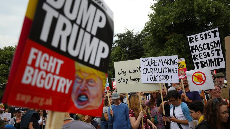 Στα πλακάτ που κρατούσαν οι συμμετέχοντες, αναγράφονταν συνθήματα όπως «Τραμπ, μια ειδική σχέση; Πείτε απλά όχι», «Σταμάτα να λες ψέματα».