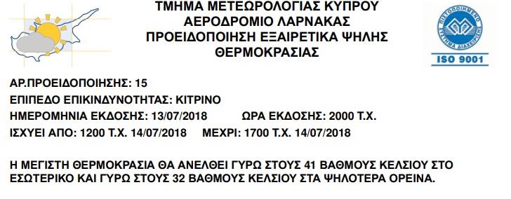 Σε παλαιότερη ανακοίνωση του το Υπουργείο Υγείας , λόγω των υψηλών θερμοκρασιών, οι οποίες αναμένονταν από πριν να επικρατήσουν σήμερα αλλά και κατά τις επόμενες ημέρες, υπενθυμίζουν στο κοινό τα βασικά μέτρα για την πρόληψη των ανεπιθύμητων επιδράσεων στον ανθρώπινο οργανισμό.