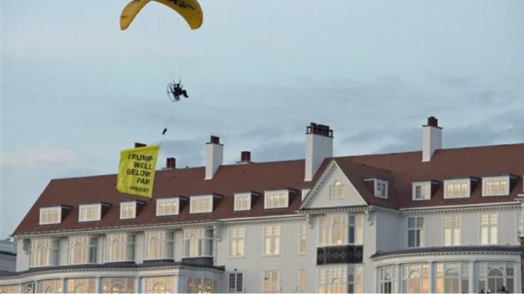 Η ανάρτησή του προφανώς εκλήφθηκε ως ...πρόσκληση για τον ακτιβιστή που εφόρμησε από αέρος με παραμοτέρ (αλεξίπτωτο με μηχανή), σε απόσταση μερικών εκατοντάδων μέτρων από τον Αμερικανό πρόεδρο ο οποίος στεκόταν έξω από την είσοδο του ξενοδοχείου του γηπέδου.