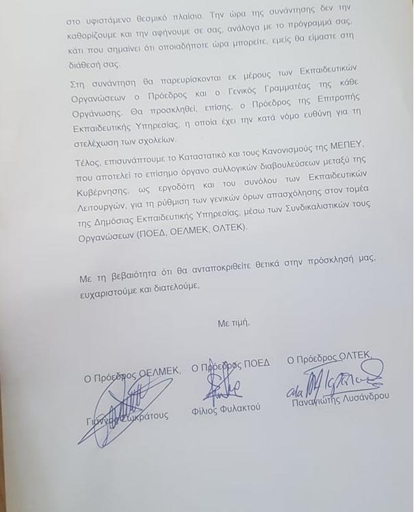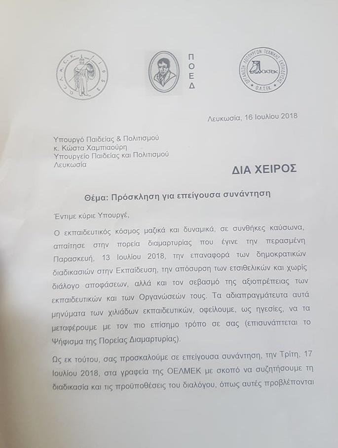 Το υπόμνημά τους, διά του οποίου διαβιβάζεται στον Υπουργό Παιδείας το αίτημά τους για επείγουσα συνάντηση, δόθηκε από αντιπροσώπους των τριών συντεχνιών  που μετέβησαν στο Υπουργείο Παιδείας, στη Γενική Διευθύντρια του Υπουργείου, Αίγλη Παντελάκη. Το υπόμνημα επέδωσε εκ μέρους των συνδικαλιστικών οργανώσεων ο πρόεδρος της ΠΟΕΔ Φίλιος Φυλακτού. <
