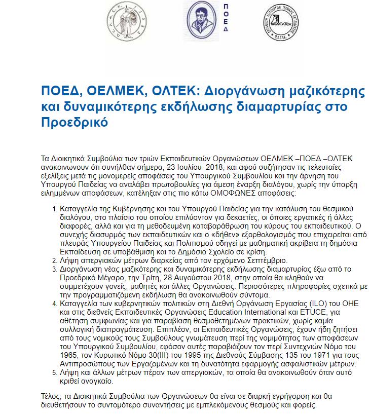 Αυτούσια η ανακοίνωση των εκπαιδευτικών οργανώσεων:
