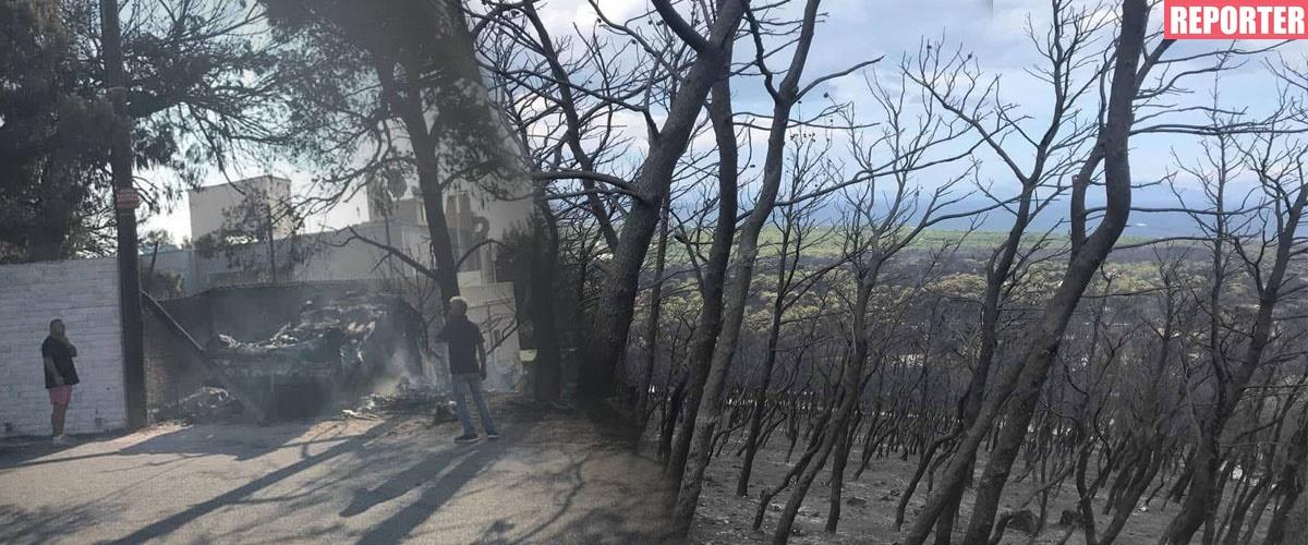 O φωτογραφικός φακός του REPORTER -που βρέθηκε στην περιοχή- αποτύπωσε τη γύμνια της γης και τις καταστροφές που άφησε πίσω της η φονική πυρκαγιά. Μια τεράστια έκταση από δέντρα εξαφανίστηκε, σπίτια ερειπώθηκαν και οχήματα καταστράφηκαν.