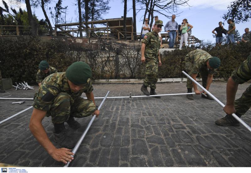 Σκηνές ως καταφύγιο για όσους έχασαν τα σπίτια του στην φονική πυρκαγιά, στήνουν στο Μάτι, άνδρες των Ενόπλων Δυνάμεων της Ελλάδας.