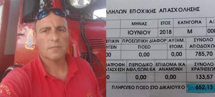«15 χρονιές στην υπηρεσία ως εποχικός πυροσβέστης, με 652 ευρώ μισθό, θα αφήσω και την ψυχή μου και την τελευταία μου πνοή πάνω στο καθήκον αν χρειαστεί... Θέλω να προσφέρω το σπίτι μου στο χωριό ΚΑΣΤΑΝΙΑ ΠΙΕΡΙΑΣ σε οικογένεια πυρόπληκτων για όσο χρειαστεί», έγραψε ποστάροντας τη μισθοδοσία του.