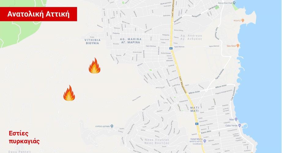Παράλληλα, στην περιοχή της Ανατολικής Αττικής εμφανίζονται θερμικά σημεία εστιών πυρκαγιάς με ριπές, με εντάσεις που έφτασαν τα 120 χλμ την ώρα, με αποτέλεσμα η πυρκαγιά να επεκταθεί σε λιγότερο από μιάμιση ώρα μέχρι την παραλία.