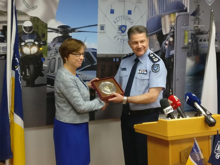 Η Αστυνομία της Κύπρου αποτελεί έναν αξιόπιστο εταίρο για την Europol και η Κύπρος γενικότερα διατηρεί χαμηλότερο δείκτη εγκληματικότητας σε σχέση με άλλες ευρωπαϊκές χώρες, τόνισε η Διευθύντρια της Europol Catherine De Bolle, η οποία πραγματοποιεί επίσκεψη στην Κύπρο και σήμερα είχε συνάντηση με τον Αρχηγό Αστυνομίας Ζαχαρία Χρυσοστόμου.