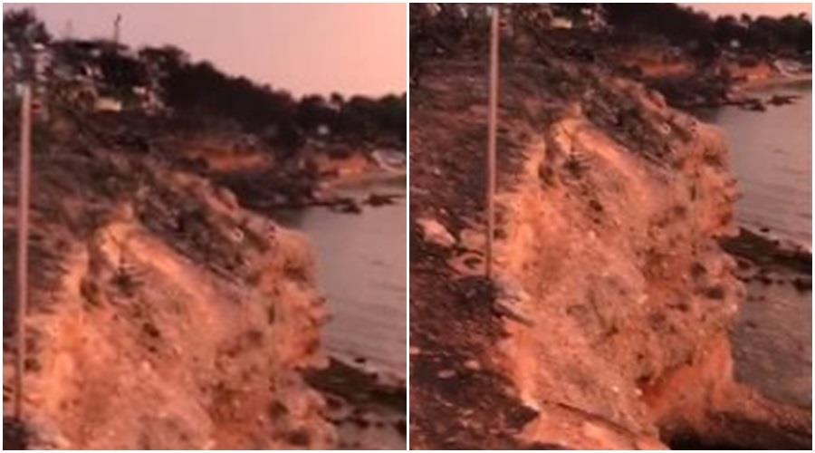 Έχασε κάποιον δικό του άνθρωπο, μία από τις ψυχές που έσβησαν στη φωτιά της 23ης Ιουλίου. Και τώρα βρίσκεται εκεί, βαδίζει στα βήματα που πιθανόν να ακολούθησε κι εκείνος... Κοντοστέκεται αρκετές φορές και κοιτάζει γύρω του, μία προς τη θάλασσα, τον γκρεμό, τα βράχια, μία προς την καμμένη γη, τα δέντρα, τα αυτοκίνητα, τα σπίτια.