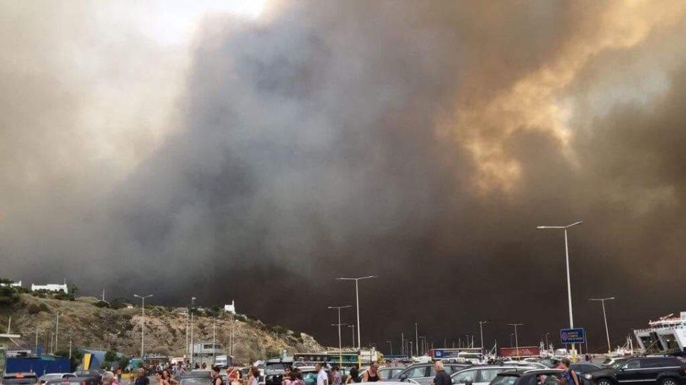 Οι καπνοί έχουν πνίξει το λιμάνι, οι φλόγες έχουν φτάσει μέχρι και στο εκκλησάκι του Αγίου Νικολάου που δεσπόζει του λιμανιού και όπως καταγγέλουν επιβάτες, ουδείς ήταν εκεί να τους κατευθύνει προς τα πού να κινηθούν.