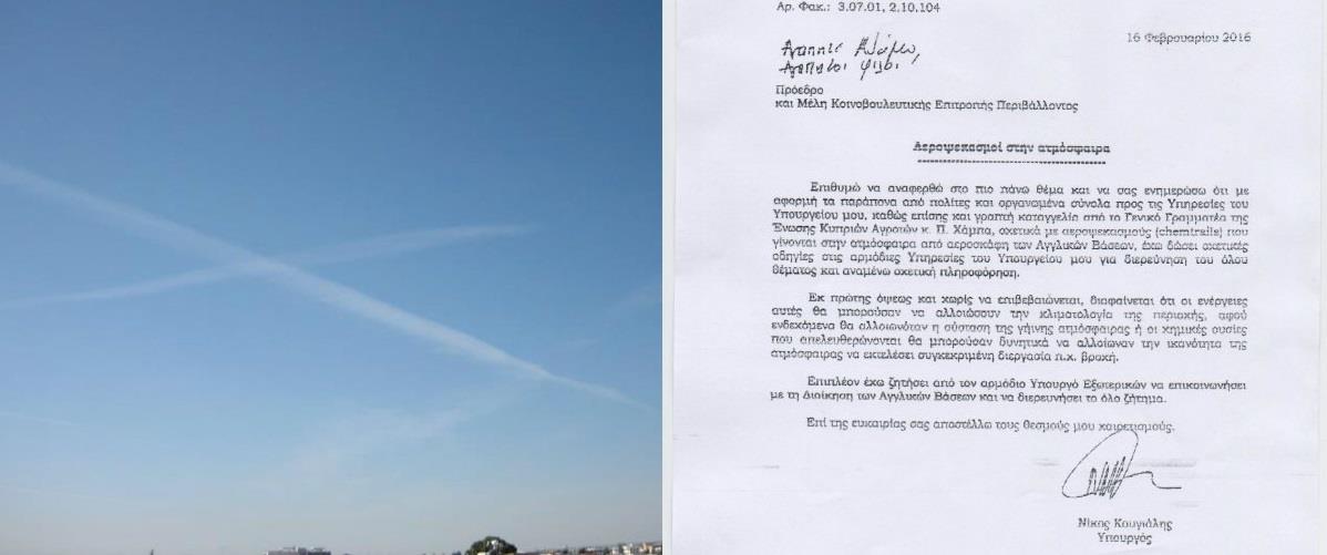 Έρευνα για πιθανούς επικίνδυνους αεροψεκασμούς από τις Βρετανικές Βάσεις, που επιρεάζουν το κλίμα, διέταξε ο Υπουργός Γεωργίας Νίκος Κουγιάλης.