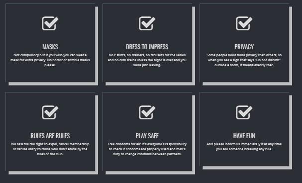 Όπως αναφέρεται στην ιστοσελίδα τα πάρτι απευθύνονται σε ανοιχτόμυαλα ζευγάρια και σε ελεύθερες γυναίκες. «Αν είσαι ένας περίεργος πρωτάρης που θέλει απλά να βλέπει ή ένας βετεράνος του είδους σίγουρα θα βρεις αυτό που θες στα πάρτι μας. Όταν ενταχθείς στο club θα συνειδητοποιήσεις ότι δεν περιτριγυρίζεσαι από μανιακούς του σεξ αλλά από καθημερινούς ανθρώπους που είναι λίγο πιο τολμηροί,» αναφέρει η σελίδα.