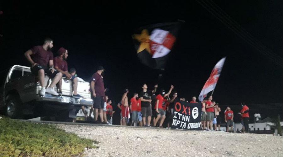 Ως ένδειξη της διαμαρτυρίας μας και μη θέλοντας να αφήσουμε την ομάδα μας μόνη διευθετήσαμε να είμαστε δίπλα της με οποίο τρόπο μπορούμε. Χτες πριν φτάσει η αποστολή στο γήπεδο πέρασε απο τον σύνδεσμο μας στο Παραλίμνι ( Σύνδεσμος Φιλάθλων Red Rebels Αμμοχώστου ) όπου υποδεχτήκαμε τους παίχτες δημιουργώντας μια εκπληκτική ατμόσφαιρα. Έπειτα ακολούθησε πορεία προς το γήπεδο με υψωμένα τα λάβαρα του 48. Βρεθήκαμε έξω απο το γήπεδο και για 10 λεπτά φωνάξαμε συνθήματα ενάντια στην κάρτα οπαδού σε συνεννόηση με αντιπροσωπία της Θυρας 26. Τελικά κατακλύσαμε τον τοπικό μας σύνδεσμο και είδαμε την αγαπημένη μας ομάδα.