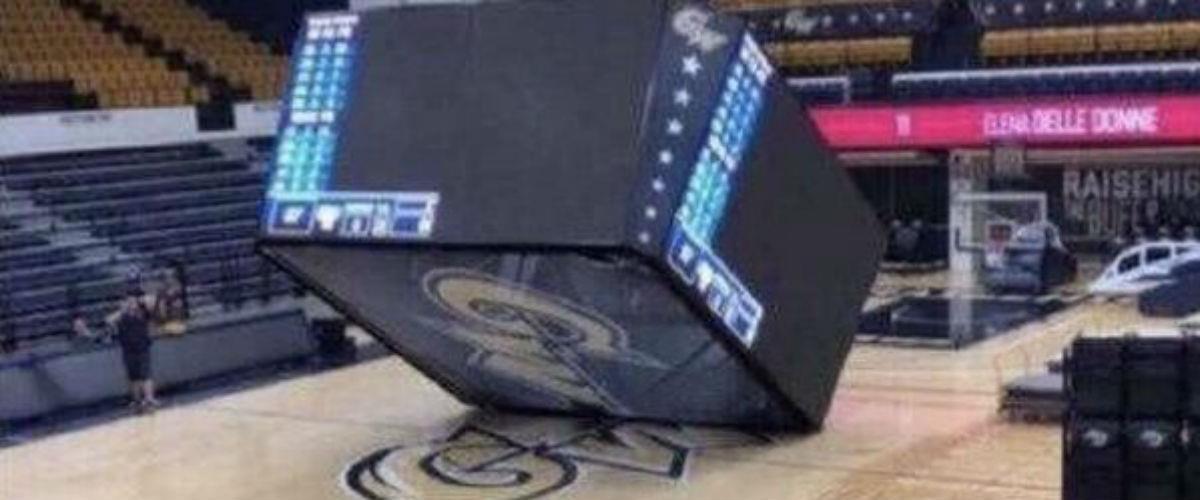 Mια αν μη τι άλλο περίεργη εικόνα είδαν όσοι βρέθηκαν την Τρίτη (11/9) στο γήπεδο μπάσκετ του Πανεπιστημίου George Washington, καθώς το jumbotron (ο φωτεινός πίνακας που βρίσκεται στο κεντρικό σημείο της οροφής) κατέρρευσε ενώ βρισκόταν σε διαδικασία συντήρησης. Ευτυχώς δεν υπήρξε τραυματισμός, όπως ανακοινώθηκε από τους ανθρώπους του Πανεπιστημίου μέσω Twitter.