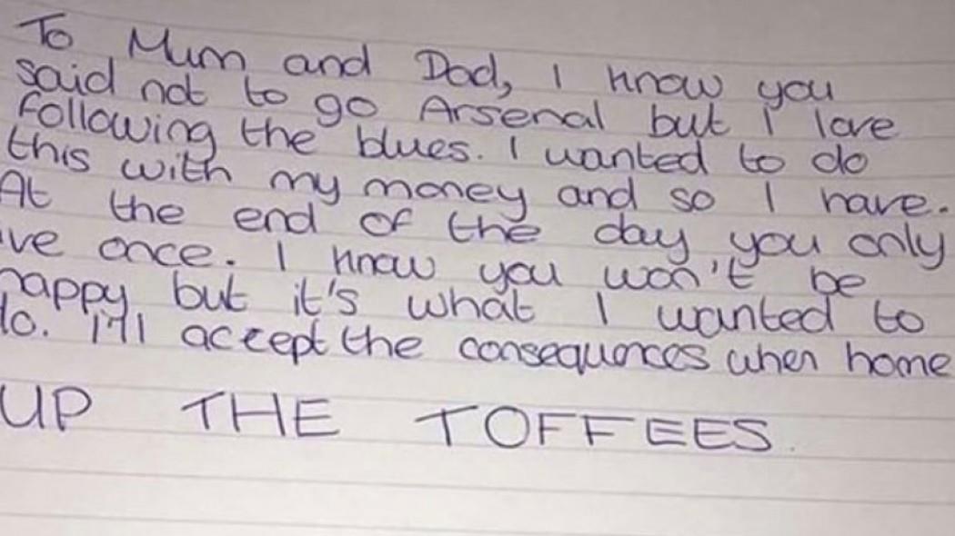 «Μαμά, μπαμπά, ξέρω ότι μου είπατε να μην πάω στην Άρσεναλ, αλλά λατρεύω ν' ακολουθώ την ομάδα. Ήθελα να παω στο γήπεδο με δικά μου χρήματα και το έκανα. Στο τέλος της ημέρας, ζεις μονάχα μια φορά! Ξέρω ότι δεν θα είστε χαρούμενοι με την κίνησή μου, αλλά θα αντιμετωπίσω τις συνέπειες μόλις επιστρέψω στο σπίτι, Εμπρός ζαχαρωτά» έγραψε στο σημείωμα που άφησε στους γονείς του.