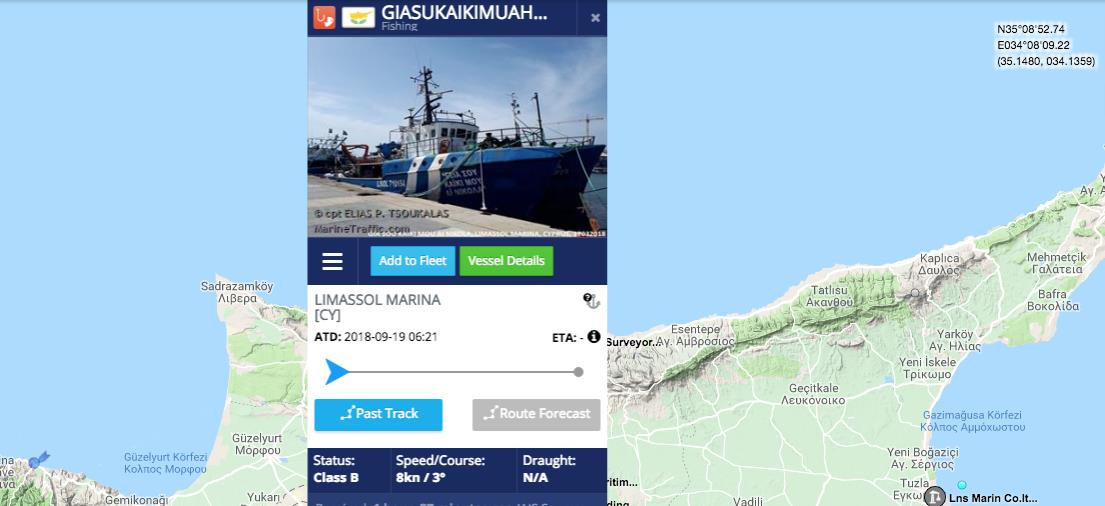 Σύμφωνα με την ιστοσελίδα Marine Traffic το ψαροκάικο βρίσκεται τέσσερα ναυτικά μίλια από το λιμάνι της Κερύνειας με κατεύθυνση τη Λεμεσό.