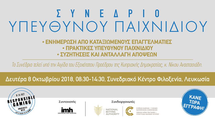 H Εθνική Αρχή Στοιχημάτων και η Εθνική Αρχή Παιγνίων και Εποπτείας Καζίνο διοργανώνουν για 1η φορά το «Συνέδριο Υπεύθυνου Παιχνιδιού», τη Δευτέρα 8 Οκτωβρίου 2018, 08:30-14:00, στο Συνεδριακό Κέντρο Φιλοξενία στη Λευκωσία.