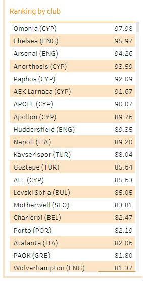 Την ομάδα της Λευκωσίας ακολουθούν στον σχετικό πίνακα δύο αγγλικές ομάδες, η Τσέλσι με ποσοστό 95,97% και η Άρσεναλ με 94,26%.