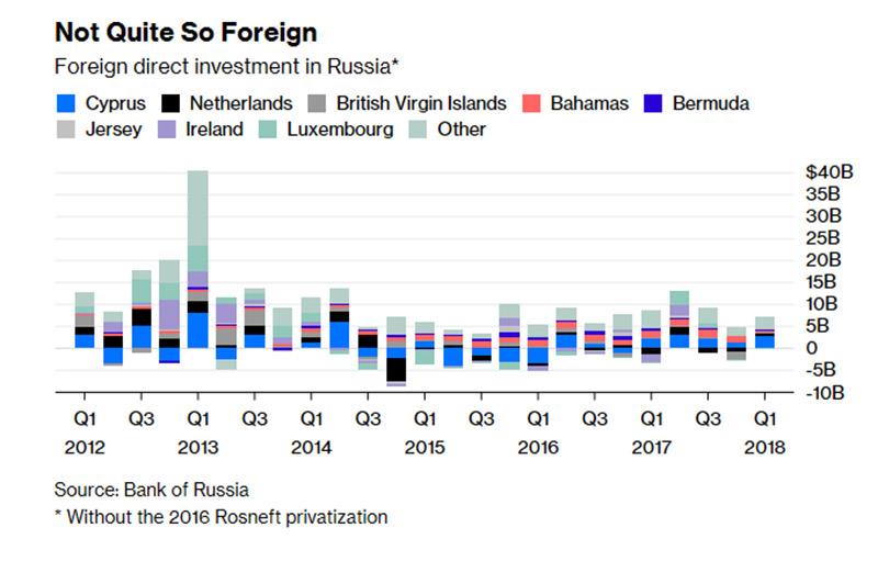Γύρω στα €10 δις ($11,44 δις) υπολογίζονται οι άμεσες ξένες επενδύσεις από την Κύπρο προς την Ρωσία από τον Ιανουάριο του 2017 μέχρι και τον Μάρτιο του 2018, επενδύσεις οι οποίες σύμφωνα με το ειδησεογραφικό πρακτορείο Bloomberg δεν αποτελούν και τόσο «ξένες», καθώς στην πλειοψηφία τους αποτελούν επενδύσεις από ρωσικές holding εταιρείες και οι οποίες εντάσσονται στο πλαίσιο στρατηγικής του Ρώσου Προέδρου για επαναπατρισμό ρωσικών κεφαλαίων.