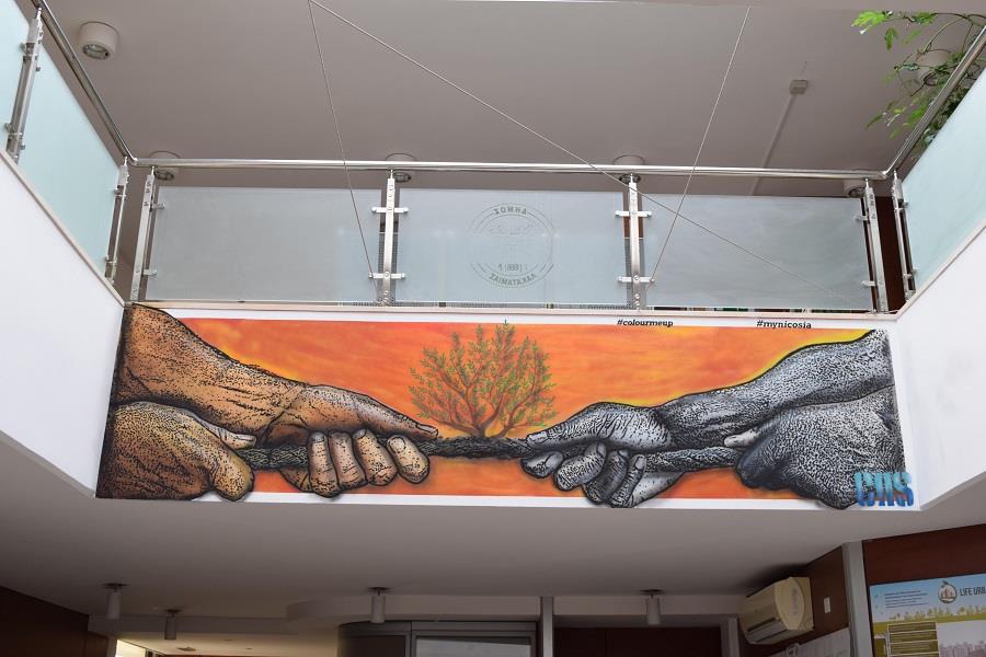 Γκράφιτι του καλλιτέχνη Χρίστου Κακουλλή, γνωστού και ως CRS, κοσμεί εσωτερικό χώρο του Δημαρχείου Λακατάμιας, σύμφωνα με ανακοίνωση του Δήμου.