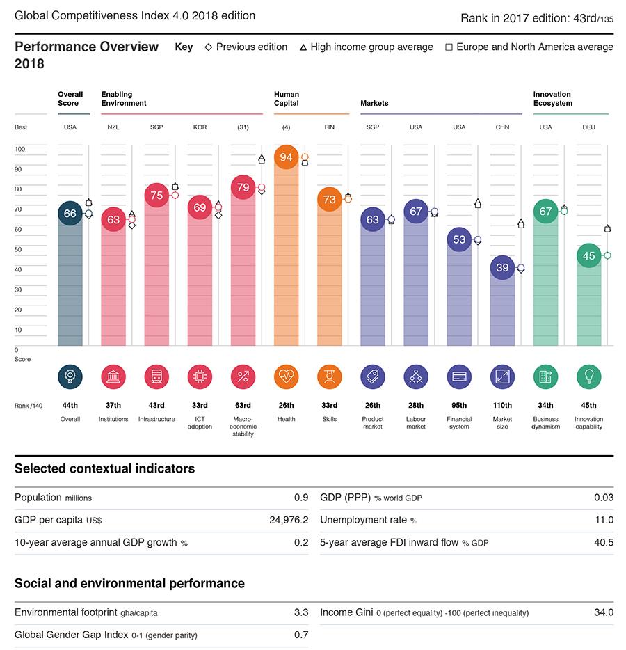 Η Κύπρος κατατάσσεται στην 44η θέση μεταξύ 140 χωρών (και 23η στις 28 χώρες της Ευρωπαϊκής Ένωσης) στην Έκθεση Ανταγωνιστικότητας του 2018 που μόλις δημοσίευσε το World Economic Forum (WEF), έχοντας υποχωρήσει από την 43η θέση το 2017.