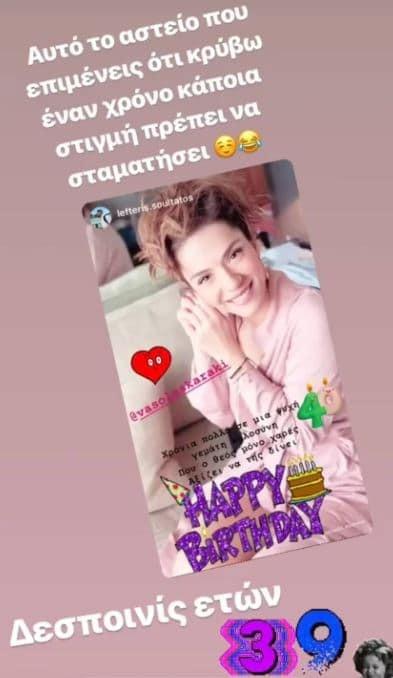 Η ίδια η Βάσω Λασκαράκη ανέβασε στο λογαριασμό της μια φωτογραφία αφιερωμένη στον εαυτό της και τα γενέθλιά της όπου στη λεζάντα γράφει ξεκάθαρα πώς σήμερα γίνεται 39.