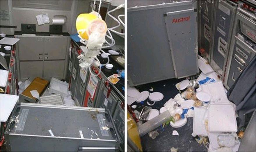 Τα ντουλαπάκια που βρίσκονται πάνω στις θέσεις των επιβατών άνοιξαν με αποτέλεσμα, τσάντες και διάφορα αντικείμενα να πέσουν στο διάδρομο και να προκαλέσουν ένα χάος, ενώ φαγητά και ποτά είχαν «πνίξει» το πάτωμα του αεροπλάνου.
